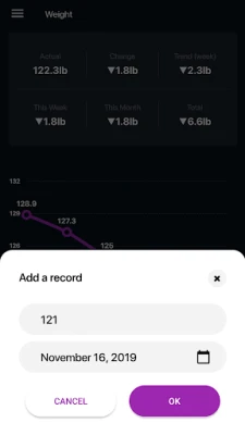 Simple Weight Tracker is a body weight watcher. It stores data provided from scale to watch and analyze weight loss. It will help you to track your body weight while on diet plan and count calories for weight loss. By tracking changes it is easier to learn how to lose weight fast. Chart and statistics help to find out what diet works for you, which diet plans or activities match you best. Test diets like keto, low carb, low calorie diet or intermittent fasting IF. Check effects for lose fat and belly fat to achieve fit weight.