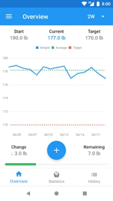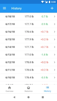 • Take a look on statistics about your weight, i.e. average weight, Body Mass Index (BMI), difference to the starting weight and even more.